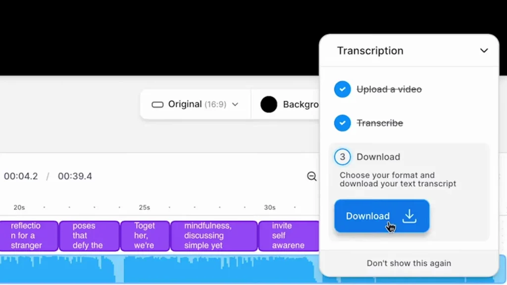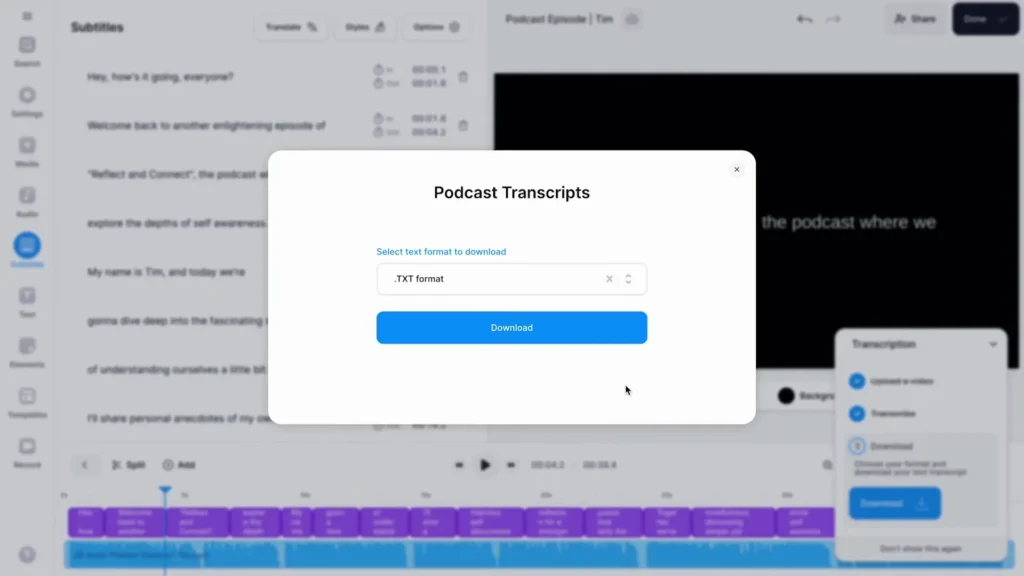 Upload your podcast file, select the language, let VEED transcribe it, customize the text if you want, and download the result as TXT for plain text or SRT/VTT for captions. That’s how you transcribe your podcast.