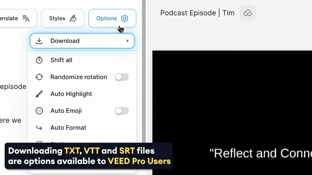 If you’re ready to download your podcast transcript, click on Options in the Subtitles menu and head over to Download.